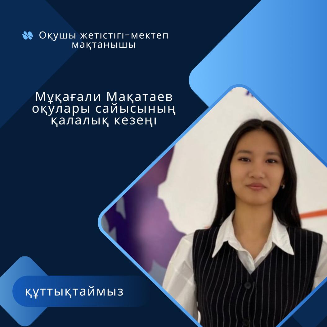 Мұқағали Мақатаев оқулары сайысының қалалық кезеңінде "Көкрегімде жыр сөулесі маздайды"бағыты бойынша 10"А" сынып оқушысы Кикимова Найзана жүлделі 2-орын алды.